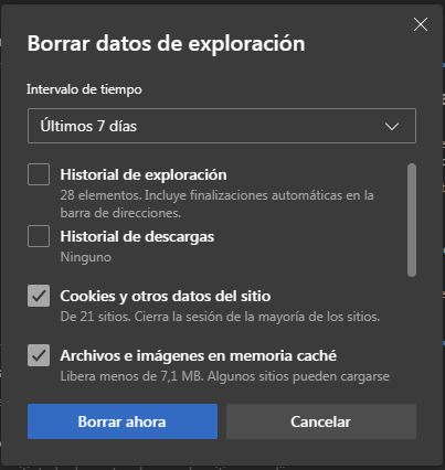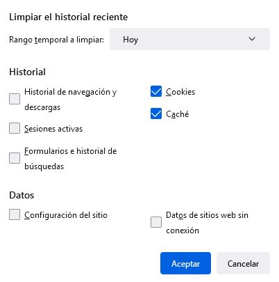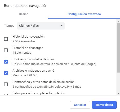 • Deberían estar marcadas tanto las cookies y datos del sitio (para eliminar los inicios de sesión y las preferencias del sitio) y el contenido web en caché (para eliminar las imágenes y scripts almacenados y otro tipo de contenido en caché).